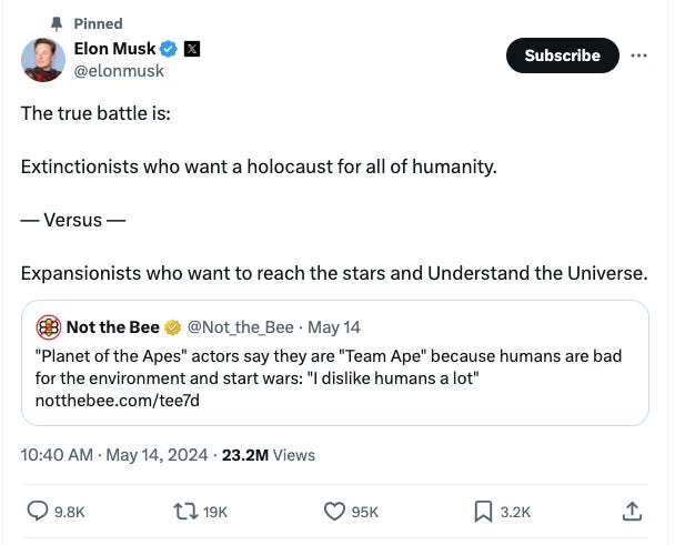 Anyway, my half-asleep brain brain caught this tweet from Elon, wherein he boils down the challenge of the two opposing sides we currently face as ultimately a battle between “Extinctionists” and “Expansionists”.